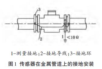 傳感器安裝在塑料管道或內(nèi)壁有絕緣涂層、襯里的管道上,兩端應(yīng)安裝接地環(huán)(或帶有接地電極的金屬短管),然后用導(dǎo)線連接,使管內(nèi)流動(dòng)的介質(zhì)與大地短路,具有零電位(見(jiàn)圖2)。