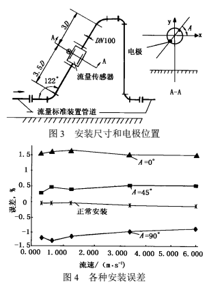 除儀表前直管段可降低彎管影響外,人們還從安裝方式上設(shè)法降低影響的方法。文獻(xiàn)曾報(bào)道電磁流量傳感器電極軸線與鄰近彎管平面成45°傾斜安裝可以減少?gòu)澒苡绊?。日本工業(yè)標(biāo)準(zhǔn)B7554“解說部分”列有電極軸線與彎管平面垂直、平行、成45°三種安裝方式,在不同長(zhǎng)度直管下的測(cè)量誤差范圍,也說明這一效果。