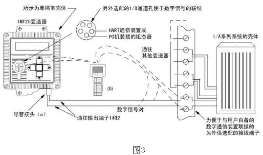 HART通信裝置或裝載在PC機(jī)上的組態(tài)器可以連接在變送器現(xiàn)場(chǎng)接線(xiàn)端到外部負(fù)載之間的任何位置,或連接到另外配供的1/0孔口上。如圖3所示: