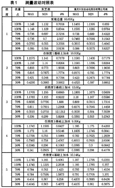 在造紙行業(yè)有大量的紙漿液體需要測量,就會用到大量的流量測量儀表,目前在造紙行業(yè)中用于測量流量的儀表,主要有防腐濃硫酸電磁流量計(jì)等儀表,因?yàn)?strong>防腐濃硫酸電磁流量計(jì)具有非常強(qiáng)的優(yōu)點(diǎn),所以非常適合在紙漿的流量測量中使用。在紙漿實(shí)驗(yàn)裝置上,使用串聯(lián)在同一管道上該公司生產(chǎn)的漿液型防腐濃硫酸電磁流量計(jì)與日本東芝的漿液型防腐濃硫酸電磁流量計(jì)測量不同濃度和流量的紙漿漿液,以驗(yàn)證其可靠性。波動率對比實(shí)驗(yàn)結(jié)果表明,該產(chǎn)品用于紙漿漿液測量時(shí)能夠很好地克服漿液噪聲。在滿流量測量時(shí),上述實(shí)驗(yàn)中各濃度下漿液測量穩(wěn)態(tài)波動率均在1%以內(nèi);其它流量下測量時(shí),由于實(shí)驗(yàn)系統(tǒng)主管道上游分流控制流速不穩(wěn),進(jìn)而導(dǎo)致測量穩(wěn)態(tài)波動率相對較大,甚至達(dá)到近7‰ 但由表1可知,在各種漿液濃度及各流量點(diǎn)下,凱銘儀表有限公司生產(chǎn)的漿液型防腐濃硫酸電磁流量計(jì)的穩(wěn)態(tài)波動率始終與日本東芝漿液型防腐濃硫酸電磁流量計(jì)的測量結(jié)果一致,從而表明實(shí)驗(yàn)系統(tǒng)的測量結(jié)果能準(zhǔn)確反映實(shí)際漿液流量大小。 說明:MAX、MIN分別表示該組數(shù)據(jù)測得流速的的*大值和*小值,單位m/s。
