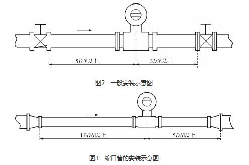 硝酸管道流量計(jì)的安裝質(zhì)量對(duì)其測(cè)量結(jié)果的影響較大,因此在安裝時(shí)需要注意幾個(gè)問(wèn)題。*先,硝酸管道流量計(jì)直管段的選擇在配管時(shí)一定要按照要求進(jìn)行選擇,一般選擇流量計(jì)通徑與工藝管道通徑相同,即可滿(mǎn)足工程需要,而且安裝方便、壓力損失小,流量計(jì)直管段上游側(cè)的長(zhǎng)度不少于5倍工藝管道直徑,下游側(cè)的長(zhǎng)度不少于3倍工藝管道直徑(圖2)。但在流速太慢而又要求精度較高或需要變徑的應(yīng)用場(chǎng)合,可選擇通徑小于工藝管道通徑的流量計(jì),以提高測(cè)量精度,此時(shí)流量計(jì)上、下游必須加裝異徑管,且進(jìn)口異徑管上游側(cè)應(yīng)有長(zhǎng)于10倍工藝管道直徑的直管段,下游側(cè)應(yīng)有長(zhǎng)于5倍工藝管道直徑的直管段(圖3)。