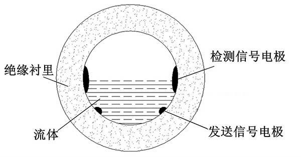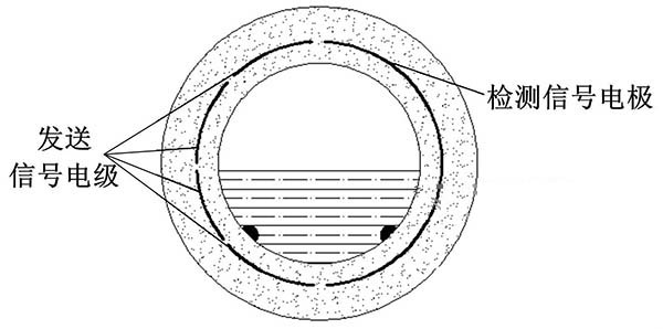 ③利用阻抗或信號(hào)衰減研制的非滿管工業(yè)污水流量計(jì)。這種結(jié)構(gòu)的非滿管工業(yè)污水流量計(jì)是當(dāng)前國(guó)內(nèi)研究的方向之一。其結(jié)構(gòu)是流量管底部貼一對(duì)信號(hào)發(fā)射電極,在流量管中間貼信號(hào)接收電極。由于信號(hào)在流體中傳播會(huì)產(chǎn)生衰減,且傳播時(shí)間越長(zhǎng),衰減越多,因此通過(guò)信號(hào)接收電極接收到的信號(hào)衰減量即可得知液面高度;同時(shí)該電極還能測(cè)量流體切割磁感線產(chǎn)生的電動(dòng)勢(shì),以此達(dá)到測(cè)量非滿管流量的目的。阻抗式或信號(hào)衰減非滿管工業(yè)污水流量計(jì)結(jié)構(gòu)簡(jiǎn)圖如圖5所示。