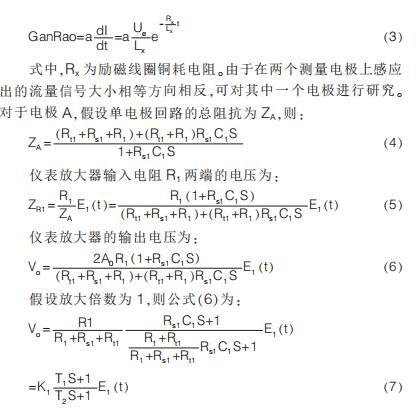 提出在硬件電路上加入模擬開關, 干擾尖峰到來時斷開模擬開關避免干擾進入后級電路,尖峰過去重新打開模擬開關;K.Saito 等提出漂移校正法,先以高勵磁頻率進行勵磁,在勵磁過程中插入低勵磁頻率提取用于漂移校正的非固定微分噪聲分量,但在插入的低勵磁頻率段漿液噪聲較大且很難將漿液噪聲與流量信號分離,此時的校正因子非單純的非固定噪聲分量,改進措施是長時間取平均值得到穩(wěn)定因子。 傳統(tǒng)方法是同步采樣保持法,即在磁場穩(wěn)定階段采樣。 其他消除干擾的方法有設置干擾補償機構(gòu)、控制勵磁電流變化率減小干擾幅值、矩形波代替梯形波、希爾伯特黃變換結(jié)合傅里葉變換和程控增益技術(shù)等。經(jīng)上述對現(xiàn)有的文獻分析與總結(jié)可知, 當前消除微分噪聲主要從信號處理方面入手,并未對影響噪聲的因素加以研究。 本文建立電極測量回路等效模型,給出仿真模型搭建、參數(shù)取值和仿真結(jié)果分析。