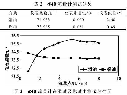 依據(jù)表1測(cè)試數(shù)據(jù),經(jīng)計(jì)算可得,Φ40流量計(jì)在滑油及燃油中測(cè)試結(jié)果如表2所示,測(cè)試線形圖如圖2所示。