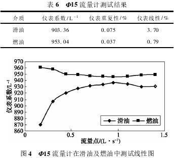 依據(jù)表5測(cè)試數(shù)據(jù),經(jīng)計(jì)算可得,Φ15流量計(jì)在滑油及燃油中測(cè)試結(jié)果如表6所示,測(cè)試線性圖如圖4所示。