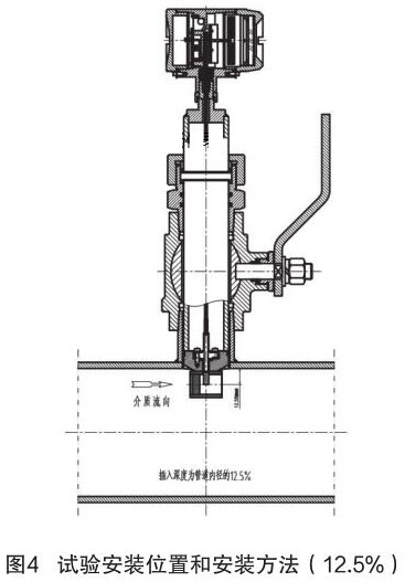 根據(jù)中華人民共和國機械行業(yè)標(biāo)準(zhǔn):JB/T9249-2015《煙氣流量計》進行插入式煙氣流量計的研制與設(shè)計。在試驗過程中,因為理論研究不充分,再加上經(jīng)驗不足,采用插入深度是按照以往其它產(chǎn)品(插入式電磁流量計)的經(jīng)驗,以插入深度為現(xiàn)場管道內(nèi)徑的 12.5% 進行試驗,其對介質(zhì)流量的檢測值與同種規(guī)格管道法蘭式結(jié)構(gòu)的煙氣流量計進行比較,偏差值較大、儀表準(zhǔn)確度無法滿足設(shè)計要求。試驗安裝位置和安裝方法如圖 4 所示。