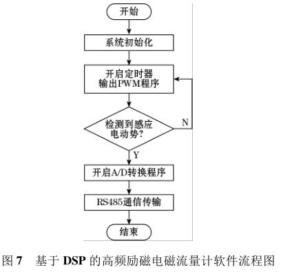 軟件流程圖如圖7 所示。軟件采用模塊化的設(shè)計(jì)方法,主要設(shè)計(jì)了勵磁控制切換程序、PWM 波產(chǎn)生程序、A/D 轉(zhuǎn)換程序以及 RS485 通信程序等。系統(tǒng)上電后*先執(zhí)行復(fù)位操作,利用 DSP 內(nèi)部的定時器產(chǎn)生PWM 波控制 H 橋電路中的勵磁方式,當(dāng)系統(tǒng)檢測到傳感器線圈輸出的感應(yīng)電動勢后,利用 DSP 內(nèi)部的 12位 A/D 轉(zhuǎn)換器對此信號進(jìn)行模數(shù)轉(zhuǎn)換,*后根據(jù)相應(yīng)算法計(jì)算出管道中被測液體的流量。