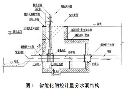分水洞采用了一種封閉式啟閉閘集成閘井預制件,包括頂節(jié)、標準節(jié)和底座。與傳統(tǒng)現(xiàn)場澆筑的方式相比,集成閘井采用防水設計,并且安裝更加方便快捷,很大程度上提高了安裝效率,節(jié)約成本。采用事先預制好的啟閉閘支座、啟閉機機座,保證了設備的安裝精度,提高了設備運行的穩(wěn)定性,減少了設備的后期維護。分水洞結構除了預制混凝土外,還可考慮采用玻璃鋼或工程塑料整體制作,用標準節(jié)調節(jié)高度。分水洞結構設計見圖 1。