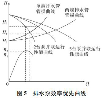 當執(zhí)行多臺排水泵同時運行時,通過排水泵特性曲線與管路特性曲線的比較,選擇非常好的匹配排水泵與排水管數(shù)量,保證排水泵在非常好的新效率點運行。如圖 5 所示。