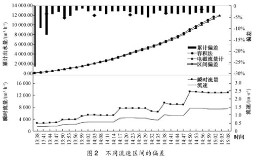 圖 2 的結(jié)果顯示,容積法校驗(yàn)電磁流量計(jì)累計(jì)偏差開(kāi)始階段不穩(wěn)定,后期趨于穩(wěn)定,在 -3. 0%附近。這是測(cè)量中不可避免存在某幾個(gè)時(shí)刻(特別出廠水流量改變時(shí))某些測(cè)量點(diǎn)液位波動(dòng)較大,導(dǎo)致記錄數(shù)值與真實(shí)情況存有較大差異,一開(kāi)始累計(jì)出水總量較少,偏差會(huì)相對(duì)放大,在后期累計(jì)水量大,這一原因?qū)е碌钠顪p少,偏差值也趨于穩(wěn)定。