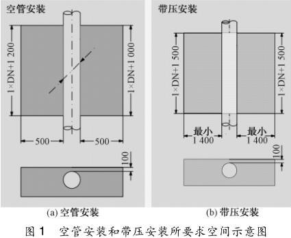 (1)要確認(rèn)在用智能液體流量計的管壁厚度及內(nèi)襯材料特性,保證換能器在管段內(nèi)壁的突出長度;(2)用氣焊切割智能液體流量計外殼時,一定要在管道內(nèi)充滿水的情況下(*好是帶壓并繼續(xù)保持管內(nèi)水在運行流動的狀態(tài))進(jìn)行,以免內(nèi)襯受熱凸起變形影響流態(tài);(3)要有足夠安裝空間(流量井),可以用原有的流量井,但管壁與流量井墻壁*小距離不小于 500 mm,流量井長不小于 1. 5 倍管徑。超聲波流量計空管安裝和帶壓安裝要求空間如圖 1 所示。