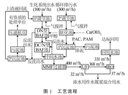 2種廢水在中間水池混勻后,通過泵提升進(jìn)入保安過濾器,進(jìn)一步去除細(xì)小的懸浮物后經(jīng)過增壓泵進(jìn)入超濾膜(UF)處理系統(tǒng)和反滲透(RO)系統(tǒng),然后通過液體電磁流量計(jì)進(jìn)行計(jì)量。反滲透出水直接進(jìn)入回用水池達(dá)標(biāo)回用,超濾濃水以及反滲透濃水用作水煤漿混合用水。污泥池中的污泥通過泵打入帶式機(jī)壓濾處理,濾液自流進(jìn)入1#調(diào)節(jié)池。工藝流程見圖1。