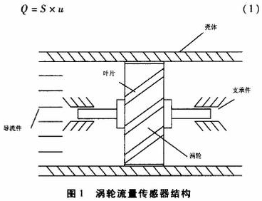 渦輪流量傳感器輸出的脈沖信號(hào)頻率F=Nxn(N是渦輪葉片數(shù),n是渦輪的旋轉(zhuǎn)速度);流過(guò)渦輪流量傳感器的被測(cè)流體體積流量Q=Sxu(S是流體的流通截面積,u流體介質(zhì)的流速);渦輪流量