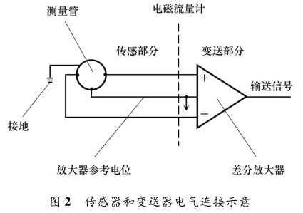 乙醇管道流量計(jì)主要由兩部分組成:流量傳感器和信號變送器,如圖 2 所示。傳感器上的勵磁線圈接受變送器傳輸來的勵磁電流產(chǎn)生磁場,輸出感應(yīng)電動勢信號;信號變送器則將感應(yīng)電動勢信號轉(zhuǎn)換為流量信號或模擬量信號送至控制系統(tǒng)。乙醇管道流量計(jì)按組成方式分為一體式和分體式。乙醇管道流量計(jì)穩(wěn)定工作另外一個重要條件是接地。當(dāng)流體流動穿過磁場時,以導(dǎo)電流體本身作為參考電位,在測量管一側(cè)電極產(chǎn)生正電勢,另一側(cè)產(chǎn)生負(fù)電勢,形成電勢差。但此電動勢信號一般只有幾毫伏,易受外界干擾。為防止干擾,將參考電位接入大地作為零電位,保證傳感器輸出精確穩(wěn)定的信號。傳感器和轉(zhuǎn)換器的接地端必須與被測介質(zhì)同電位,才能構(gòu)成對稱的輸入輸出回路。