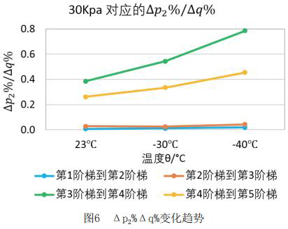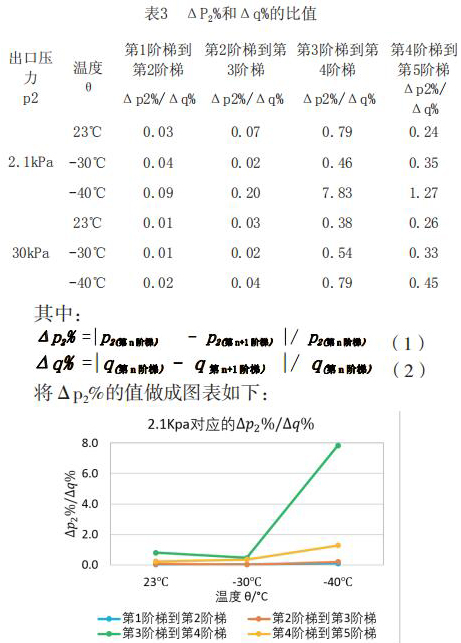 為了更直觀嚴(yán)謹(jǐn)?shù)膶?duì)比每個(gè)階段響應(yīng)速度的不同,對(duì)原始數(shù)據(jù)進(jìn)行處理,得到如下表格2和表格3。將△p2%/△q%作為響應(yīng)速度的直觀量化表達(dá),若△p2%/△q%的值大,說(shuō)明單位流量變化照成的出口壓力變化大,即說(shuō)明分體式電磁流量計(jì)響應(yīng)相對(duì)較慢,反之亦然。