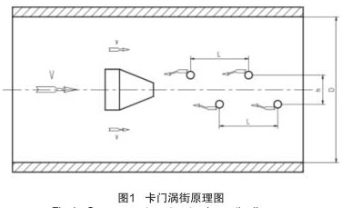 煙氣流量計實(shí)現(xiàn)流量測量的理論基礎(chǔ)是流體力學(xué)中**的“卡門渦街”原理,在流動的流體中裝置一個非線性三角柱形體,即渦旋發(fā)生體,如圖 1 所示。當(dāng)流體沿渦旋發(fā)生體繞流時,會在渦旋發(fā)生體下游產(chǎn)生兩列不對稱,但有規(guī)律交替地分離釋放出一系列漩渦束,只有當(dāng)兩渦漩列之間的距離 h 和同列的兩渦漩之間的距離 L 之比滿足 h/L=0.281 時,所產(chǎn)生的渦街才是穩(wěn)定的。
