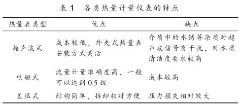 目前供熱行業(yè)內(nèi)使用的熱量計量儀表按工作原理主要分為超聲波式、 電磁式、 差壓式, 其特點見表 1 。 熱量計量儀表按結(jié)構(gòu)可分為一體式和分體式, 一體式熱量表將一支入口或出口溫度傳感器嵌入到流量傳感器管道中, 并配有專門的計算器進行熱量計算; 分體式熱量表采用單獨的流量傳感器, 包括超聲波流量計、 電磁流量計、 差壓流量計、瀝青流量計等, 溫度測量采用單獨的鉑電阻溫度計或溫度變送器測量供回水管道溫度, 再配備熱量積算儀進行溫度和流量信號采集得到熱量值。