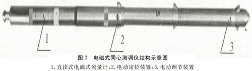 電磁式同心測調(diào)儀是同心分層注水工藝技術的關鍵儀器,其設計理念:集成流量測試與水量調(diào)節(jié)于一體,實現(xiàn)測調(diào)同 步;動力傳遞設計為同心降速機制,機械結(jié)構簡單,動力傳遞效率高,測調(diào)穩(wěn)定性高。主要包括以下結(jié)構,如圖2所示。