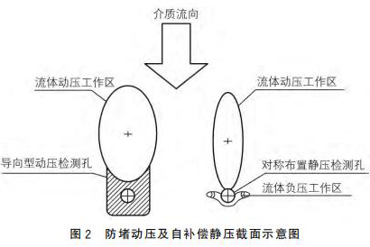 新衛(wèi)生渦輪流量計采用拋物面導(dǎo)向型結(jié)構(gòu)作為動壓測點,采用對稱自補(bǔ)償型式的靜壓測點,可以有效地解決來流方向偏流時信號的穩(wěn)定采集,來流偏離管道軸線時,可以維持輸出差壓基本不變,如圖2所示。